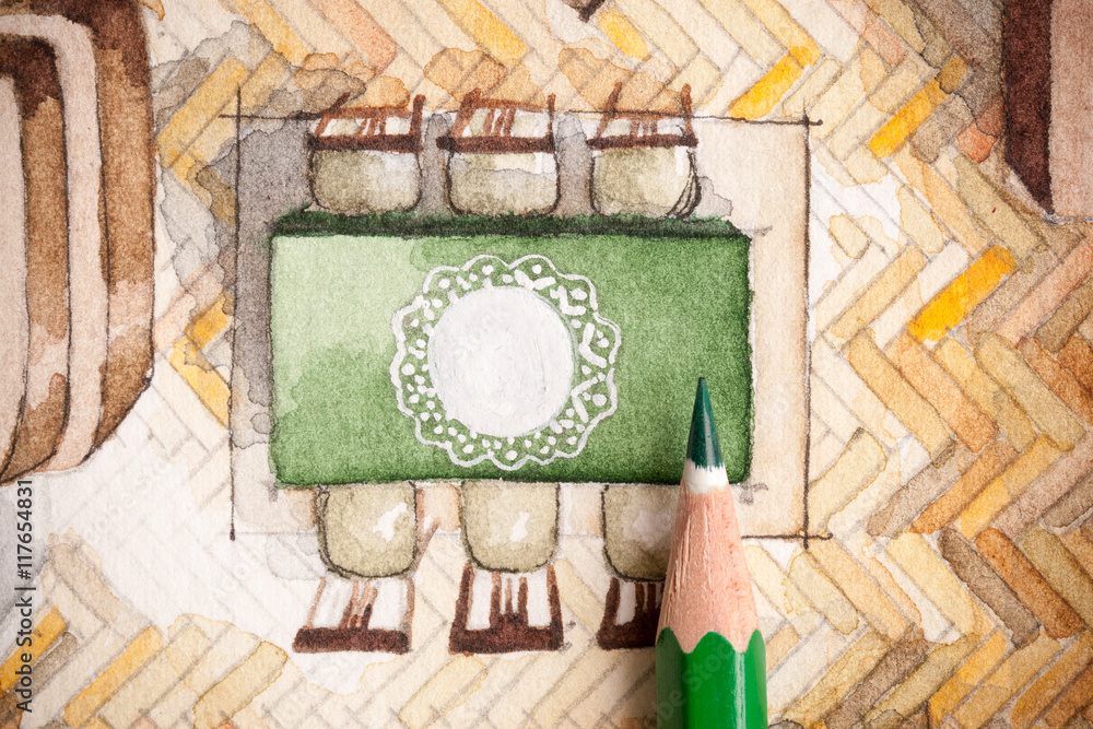 Cute Shot Of Sharp Glazed Wooden Pencil Over Watercolor Floor Plan Illustration Showing Classic Table With Six Chairs Lace Tablecloth And Parquet Flooring Stock Photo Adobe Stock